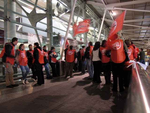 El Rossio h sido uno de los centros de reunión de l@s trabajador@s en huelga, con la presencia de un puesto móvil de la Uniòn de Sindicatos de Lisboa que allí permaneció a lo largo de todo el día. Durante la mañana, el local fue palco de la intervención de los Intermitentes con equipos de micro-piquetes atravesando la plaza a marcha lenta.